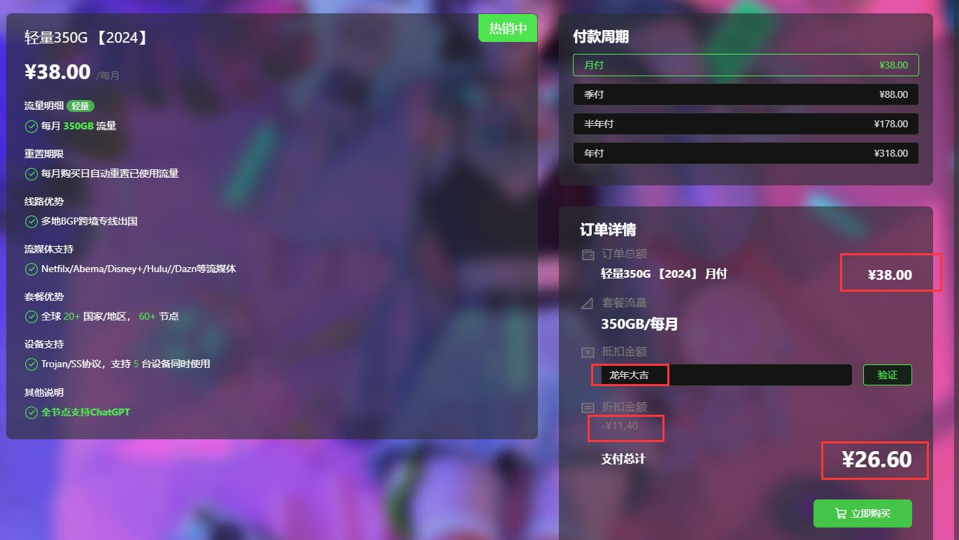 在活动期间,使用优惠码 龙年大吉 购买我们的全部套餐,即可享受-30%的优惠。