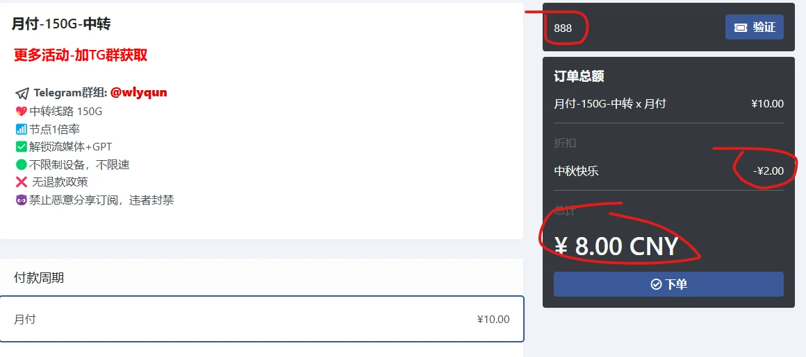 稳连云2024中秋8折扣优惠码来袭 发表评论 2024年中秋凌晨,稳连云也发布了其活动优惠码:888,所有订阅套餐都是8折。 稳连云2024中秋8折扣优惠码来袭 稳连云是一款VPN服务,提供多种套餐选项和中转线路,以满足用户的网络隐私和访问需求。 月付-150G-中转 ¥ 10.00月付 💖中转线路 150G 📶节点1倍率 ✅解锁流媒体+GPT 🟢不限制设备,不限速 ❌ 无退款政策 👿禁止恶意分享订阅,违者封禁 5/5 - (1 vote)