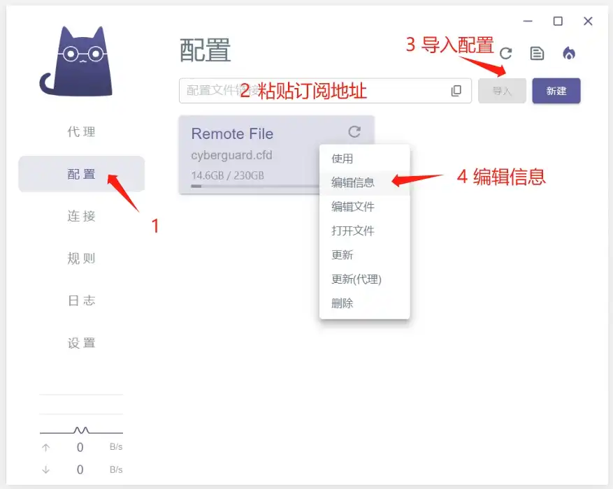 配置 → 粘贴订阅地址 → 点击导入 → 设置配置文件名称(不改也行,只要自己能区分每个机场就行)。单击选中要使用的机场,会有提示 Refresh clash config。
