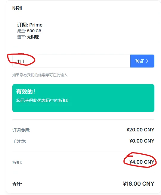购买订阅/重置流量时,优惠券填写 1111 并验证,可获得八折优惠