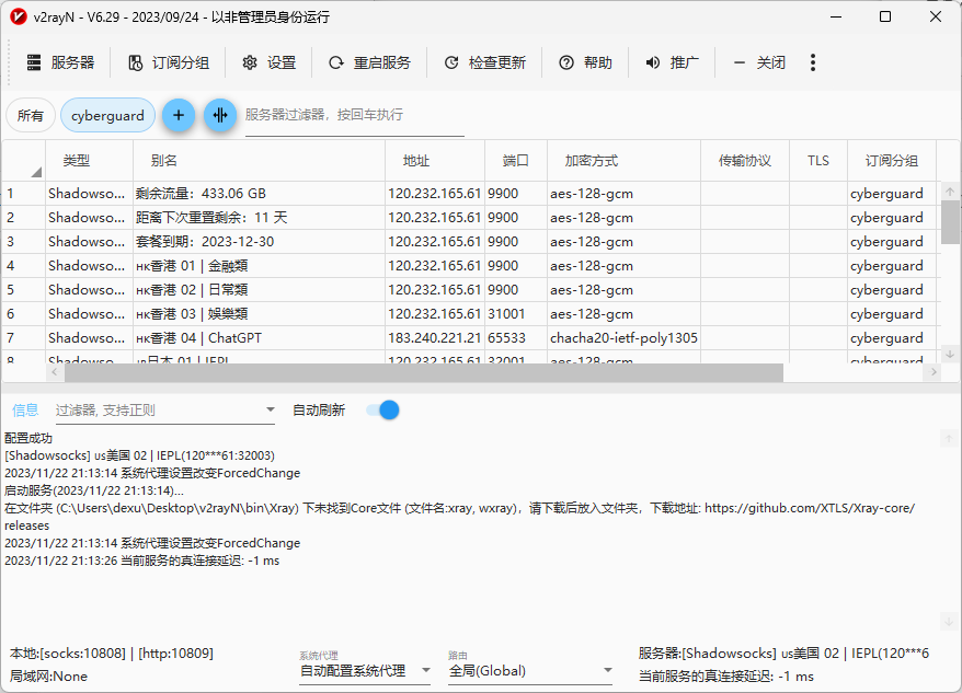 v2rayN 是 Windows 系统使用的的常用代理软件客户端,支持多种代理协议,如VMess、VLESS、Trojan、Socks、Shadowsocks 等代理协议。支持 Xray 核心和v2fly 核心,以及其他核心。