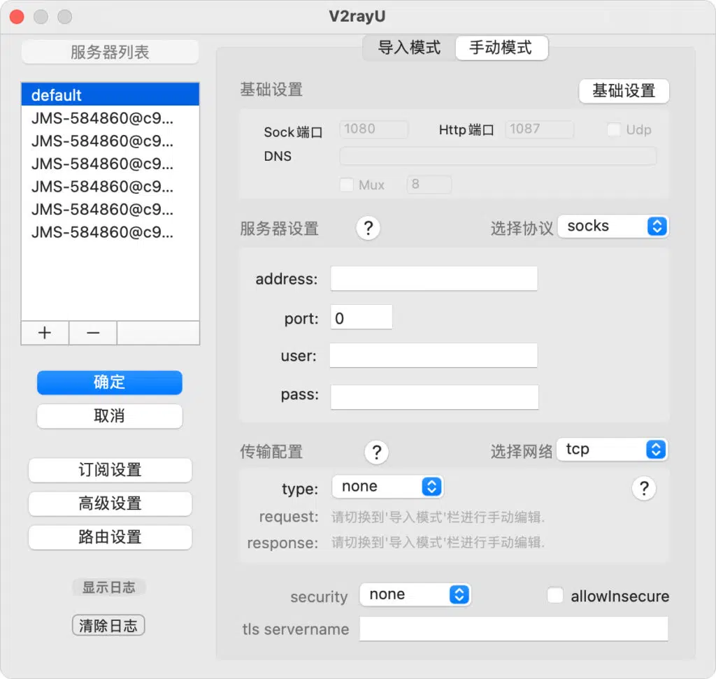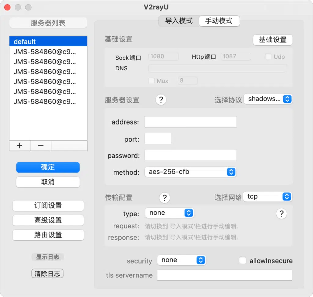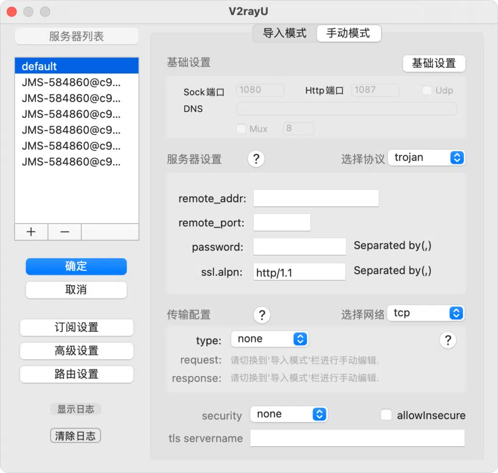- 免费节点:V2rayU软件支持VMess、Shadowsocks、ShadowsocksR、HTTP、Socks5等代理协议,如需免费节点可以使用搜索引擎搜索。