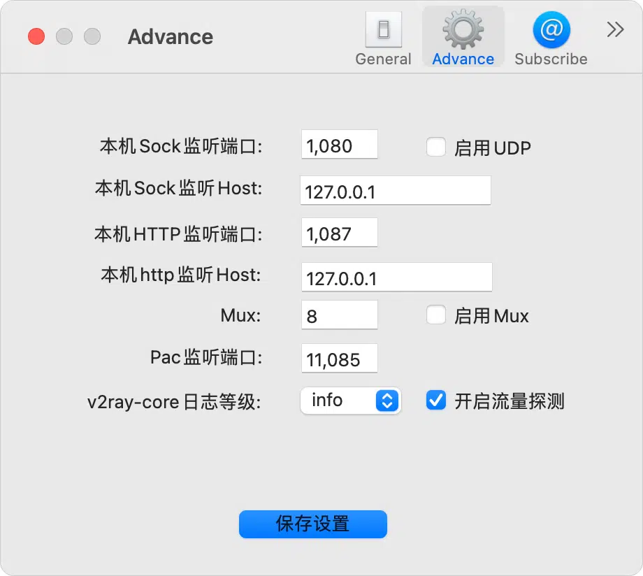打开主菜单 -> 服务器设置,点击高级设置,在这里可以配置一些高级参数,如下图所示,新用户直接默认即可。